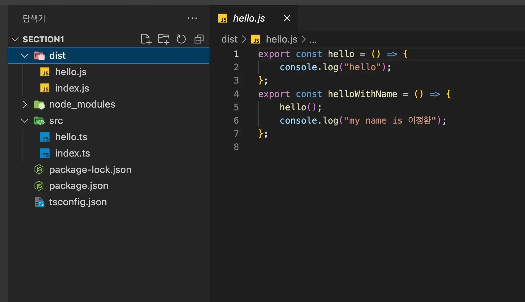COPYexport const hello = () => { console.log("hello"); }; export const helloWithName = () => { hello(); console.log("my name is 이정환"); };