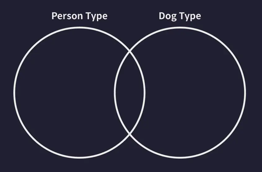 객체 리터럴 타입은 명시된 프로퍼티를 갖는 모든 객체를 포함하는 타입임을 알았습니다. 앞서 살펴본 예제의 Person과 Dog 타입간의 관계를 집합으로 표현하면 아래와 같습니다