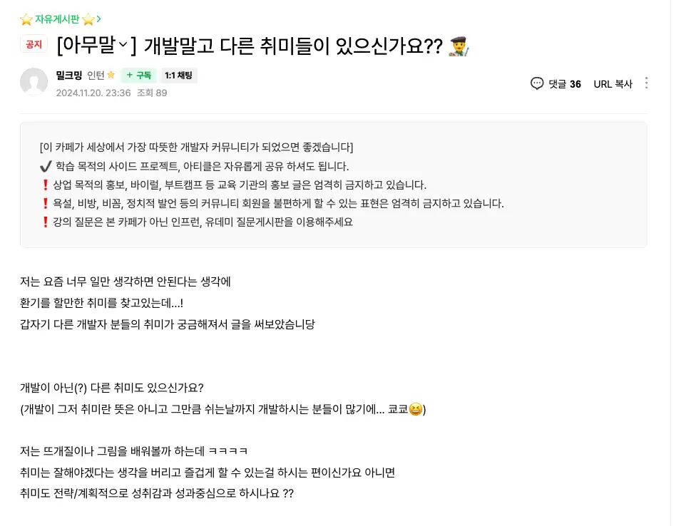 또 한 우수 회원분께서 개발 말고 다른 취미가 있냐는 게시글을 작성해주셨는데요