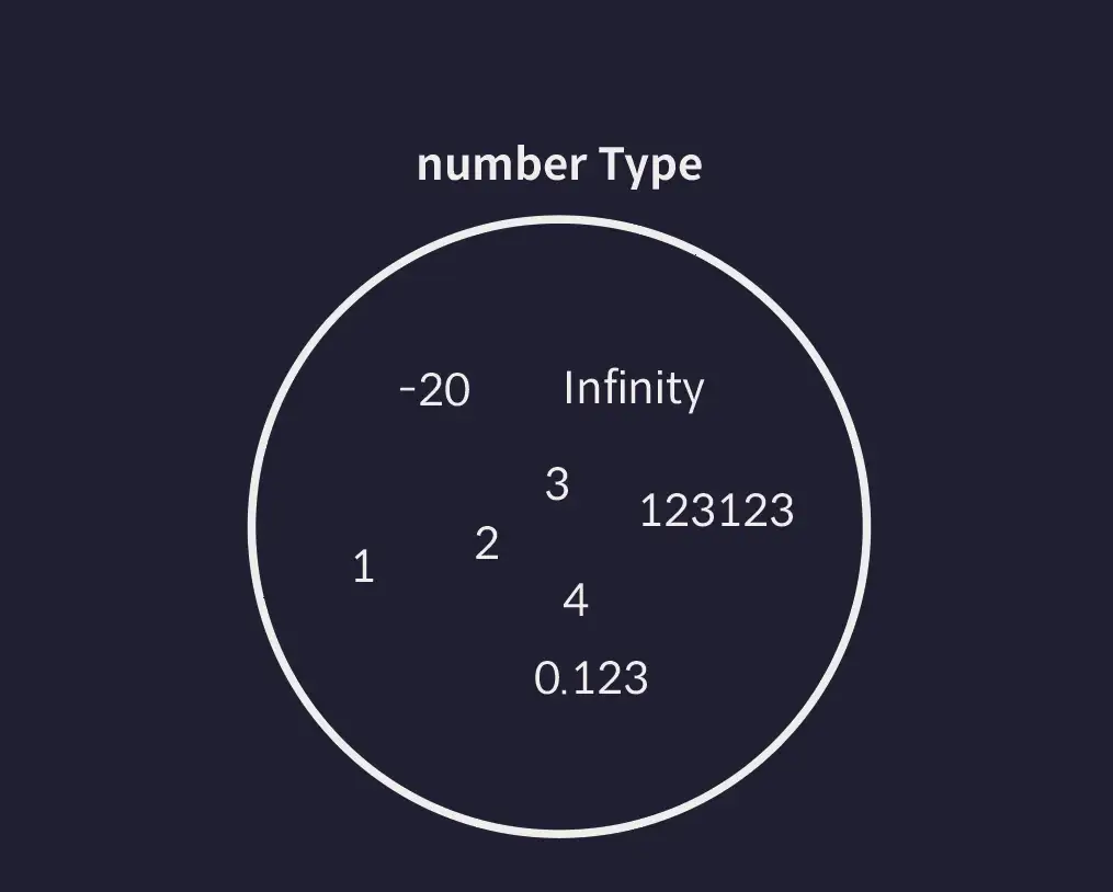 위 그림에서 표현된 것 처럼 1, 2, 4, -20 등의 숫자 값들은 number 타입이라는 집합에 포함됩니다. 이렇듯 타입은 여러개의 값을 포함하는 집합입니다. 반복합니다 타입은 집합입니다.