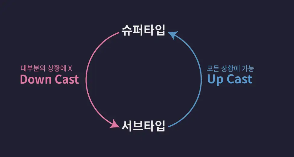- 슈퍼타입의 값을 서브타입에 할당 : 다운캐스트 (대부분 불가능 ❌)