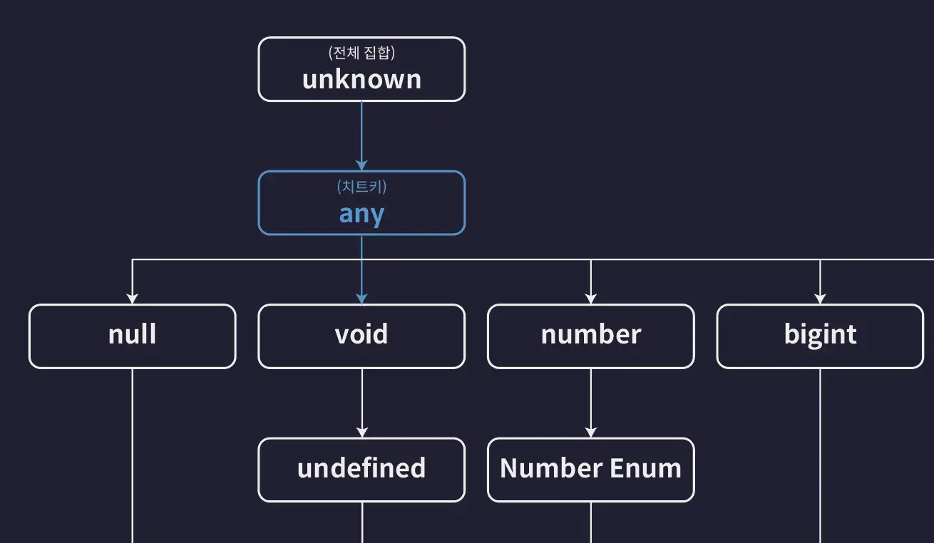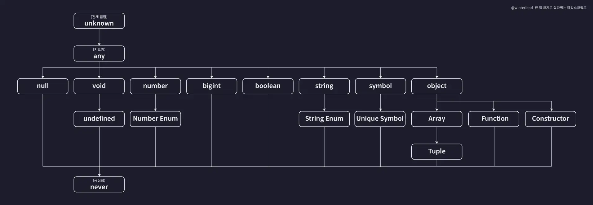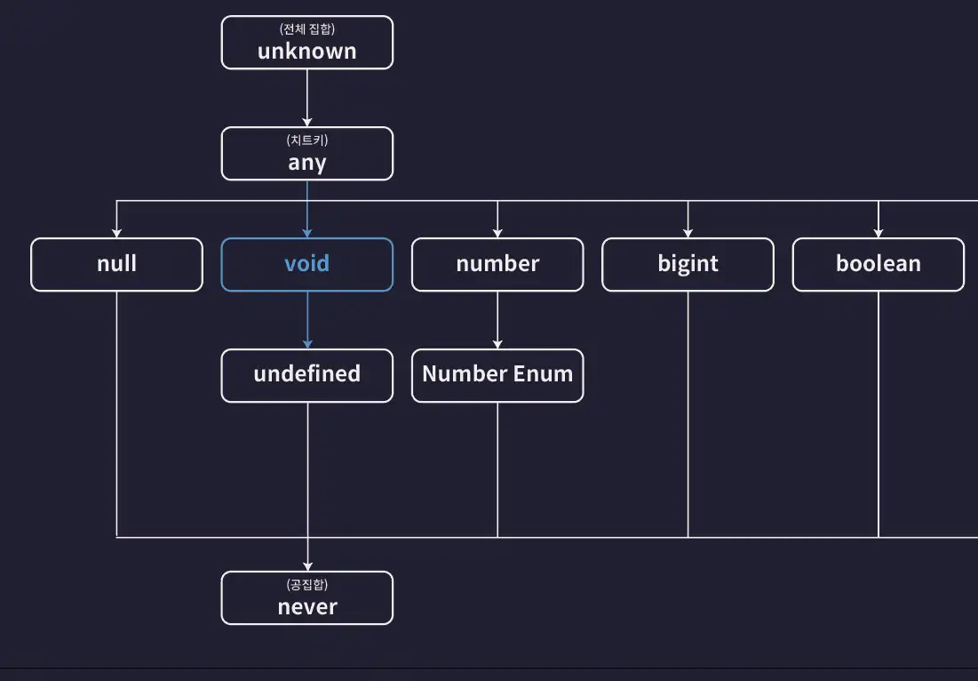 다음에는 모든 타입의 부모-자식 관계를 나타내는 타입 계층도를 살펴보며 void, any, unknown, never 타입에 대해 이해해 보겠습니다.