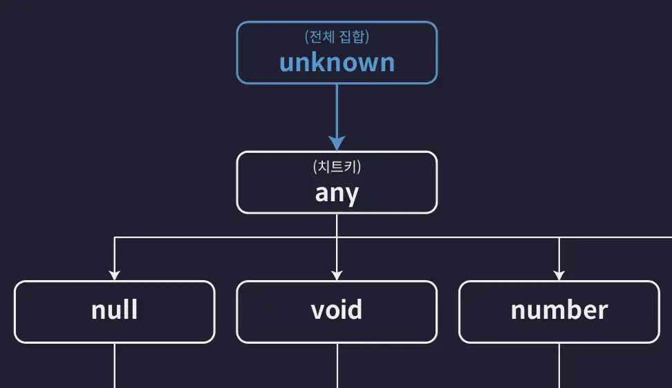 unknown 타입이 타입 계층도에서 가장 위에 위치한다는 뜻은 unknown 타입은 모든 타입의 슈퍼타입이라는 뜻 입니다. 그러므로 모든 타입은 unknown 타입의 부분집합입니다.