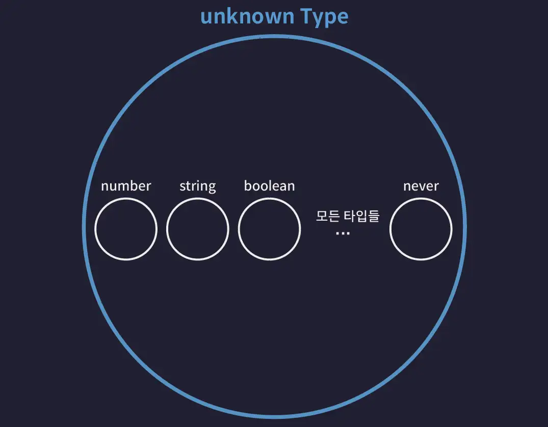 결국 unknown 타입은 모든 타입을 부분집합으로 갖는 타입스크립트 전체 집합 입니다.