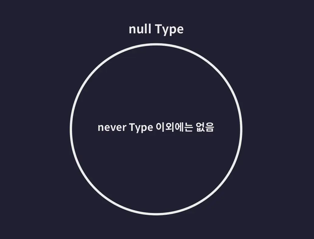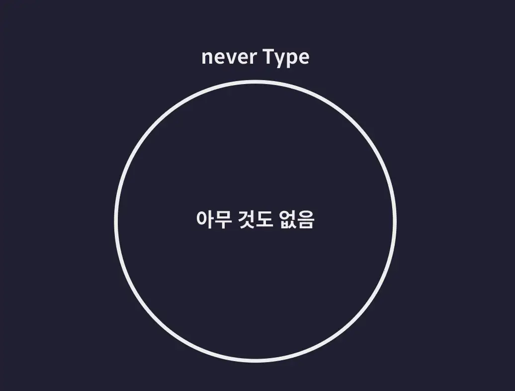 앞서 never 타입은 불가능, 모순을 의미하는 타입이라고 설명한 적이 있습니다. 타입이 집합임을 이해한 지금 never 타입을 다시 표현하자면 never는 공집합을 뜻하는 타입입니다. 수학에서의 공집합은 아무것도 포함하지 않는 집합이라는 뜻 입니다.