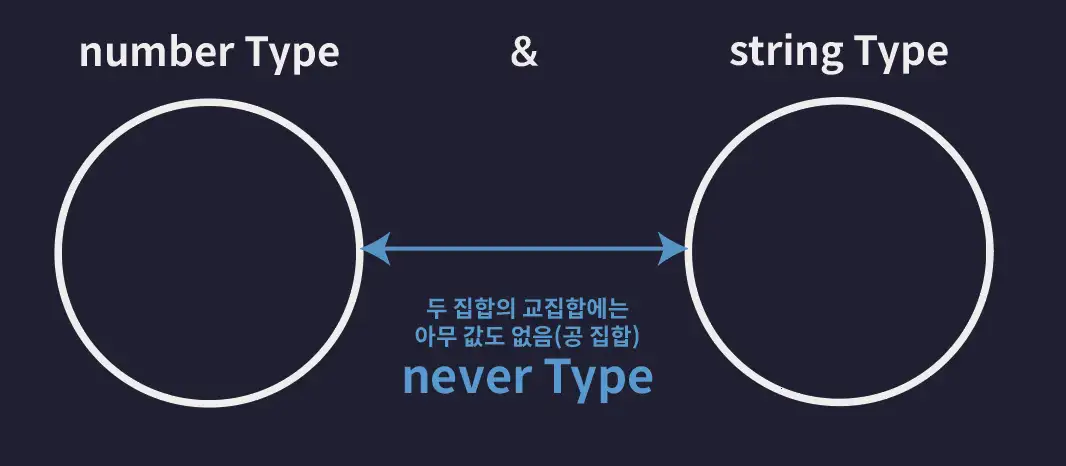 number와 string은 타입은 서로 공유하는 값이 하나도 없습니다. 그 어떤 값도 문자열이면서 숫자일 수는 없습니다. 따라서 이 둘의 교집합은 공집합이 되므로 never 타입을 갖게 됩니다.