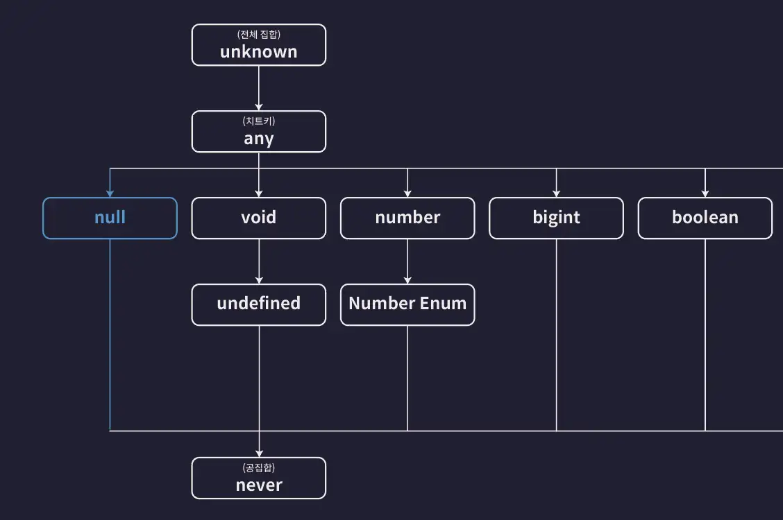 타입 계층도를 살펴보면 null 타입은 never 타입 이외에는 어떠한 타입의 슈퍼타입도 아닙니다.