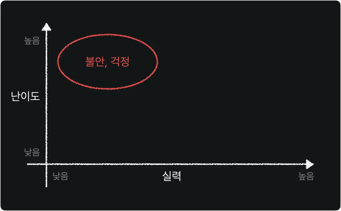 먼저 위 그림처럼 내 실력은 낮은데 난이도는 높은 그런 과제를 마주하게 되면 우리는 불안함과 걱정을 느끼게 되어 몰입하기 어렵다고 합니다.